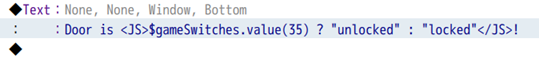 Door has been <JS>$gameSwitches.value(10) ? "unlocked" : "locked"</JS>